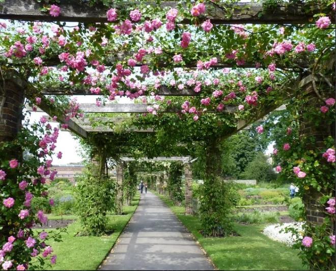 过道的常见的遮阳,是搭建如上图这种“自然”廊架,周围种满爬藤系植物或者花卉形成自然遮阳。这样日常的走动会更加的晾晒,边走边赏花,也是一种休闲,惬意。