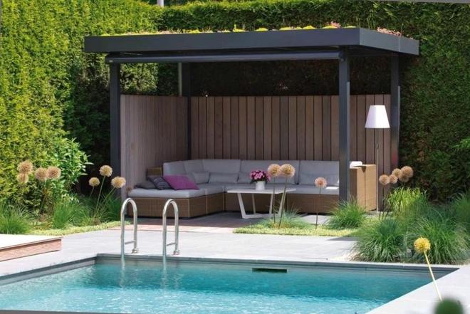 “遮阳”的同时,也可以采用一些“防暑”清爽的设计。泳池+凉棚便是其中一种。大热天的游个泳,格外的清爽。