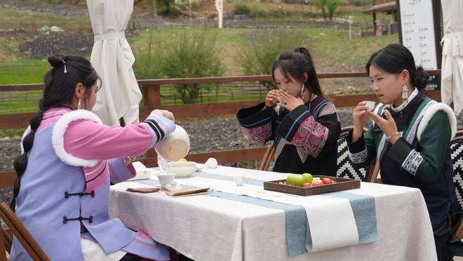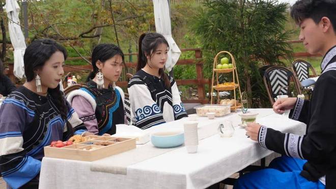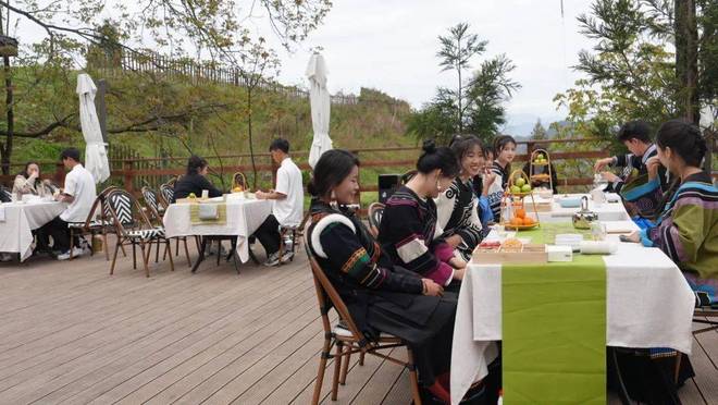 在民宿户外露台上,设有茶点茶歇区域,游客们身着民族服饰围坐于茶桌前,观看茶艺展示。