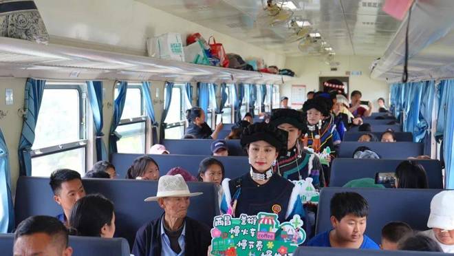 随后,他们登上从西昌开往普雄的慢火车,在车厢内展示个人才艺。歌声悠扬、舞姿翩翩,才艺表演精彩纷呈,游客们也加入其中跟着节奏尽情歌舞。