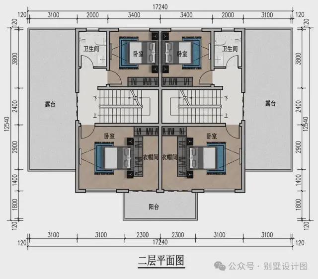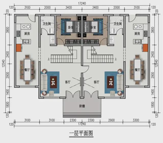 双拼住宅,室内布局完全一致,降低施工难度的同时,也能保证情感方面的统一。