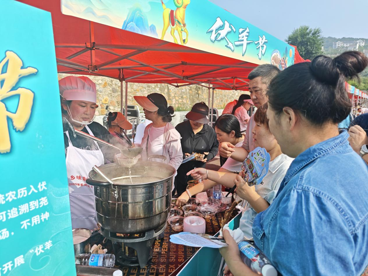 比赛场内,热辣滚烫。比赛场外的伏羊节主题摊位更是热闹非凡。白花花的羊汤里飘着绿油油的香菜,烤全羊的架子上,金黄的外皮滋滋冒油。吃烤羊、喝羊汤,现场的游客切切实实感受到“伏天吃伏羊”的绝妙之处。“这羊汤熬得太地道了,奶白的汤头,配着刚出炉的烧饼,绝了!”来自市区的张帆带着家人来蓟州避暑,正巧就住在附近的毛家峪村。