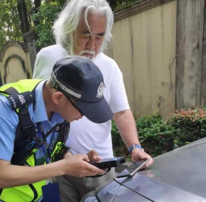 从网友拍摄的现场照片中可以观察到,他身着简洁的白色短袖和卡其色的裤子,坐在路旁,他那满头的白发在风中格外引人注目。